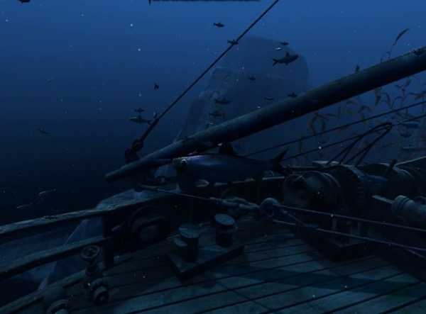 体验的第一个demo是由WEVR制作的“the Blu: Encounter”(深海大鲸鱼)。demo一开始就会让你置身于沉船甲板上。向上看,阳光透过海面直射下来。小鱼群围绕在你附近游动,他们会因为你晃动手柄而四散开。稍后,一条蓝鲸缓缓从船身旁游了过去。你可以看到它的眼睛的眨动和腹鳍的划动。鲸鱼走远后,整个demo结束。