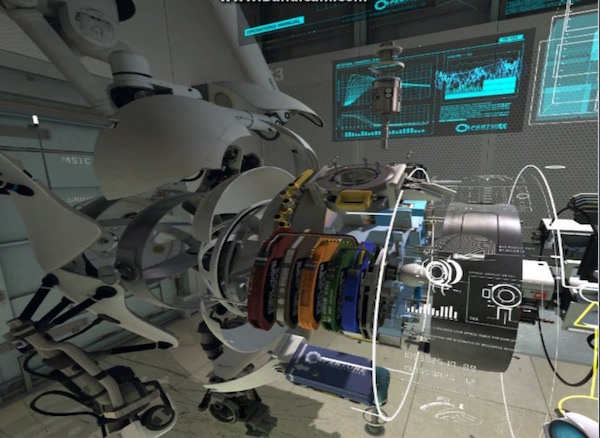 第二个demo是Valve的“Portal 2”(修不好的机器人)。相比第一个demo,Portal会增加一些交互,也需要玩家在场景中走动。由于Vive本身无法跟踪玩家身体的动作,因为没有穿戴动作捕捉设备。为了避免玩家在走动时会碰到墙,当玩家走到距离墙面大约1.5米时,游戏场景中会显示一面透明的绿色网格墙来提示玩家。在这个demo中,你可以通过手柄拉动把手,打开抽屉。这次的任务是修理损坏的机器人。当机器人走进来之后,你可以用手柄将机器人的零部件“抽离”出它的身体,然后寻找损坏的部分。如果俯下身仔细观察,你会发现demo场景和机器人做的非常细致,就连细小文字和机械零件都可以看清。