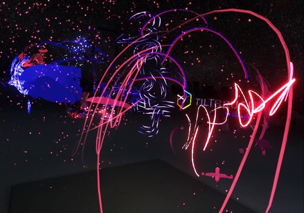 第三个demo是来自Google的TiltBrush,算是一款立体版本的Paper。工作人员介绍,迪士尼首席动画师Glen Keane就曾利用Vive和TiltBrush来绘画立体的人物。进入TiltBrush之后,右手的手柄会成为画笔,而左手的手柄顶端会被多个面板围绕,每一个面板都有不同的功能:画笔选项、调色盘、设置等。在TiltBrush中挥舞手柄并按下trigger,颜料会定格在空中,错落出层次。向你的画作方向走动,你可以穿梭在不同层次的颜色之间。