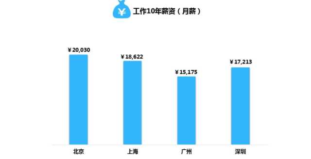生活在大城市看的见的未来是最大的动力,那么10年后工资会有多少呢?据拉勾网统计,北上广深工作10年可以拿到的月薪如下图,北京为2万,上海1万8,广州最少,平均薪水在1万5左右。