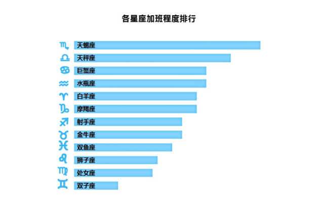 按照星座来看,天蝎座加班最严重,其次是天秤座、水瓶座,双子座加班程度最弱。PS:到11月别忘了关心一下你身边天蝎座的朋友。