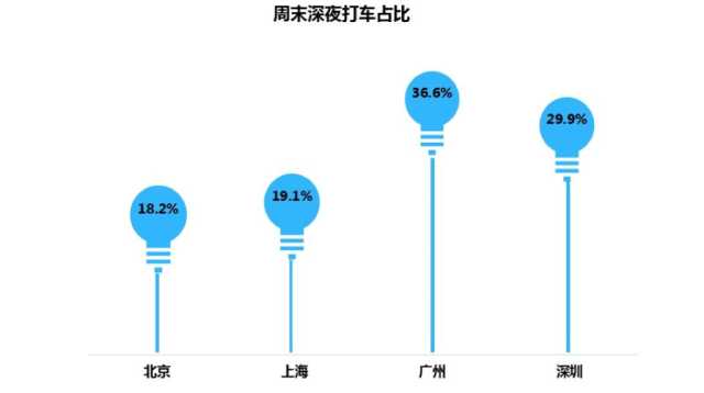 工作日努力奋斗,周末放松玩耍,成了在大城市生活年轻人的日常。滴滴大数据显示,广州周末深夜订单比例为全天的36.6%,比例之高成为名副其实的不夜城,其次为深圳、上海、北京。