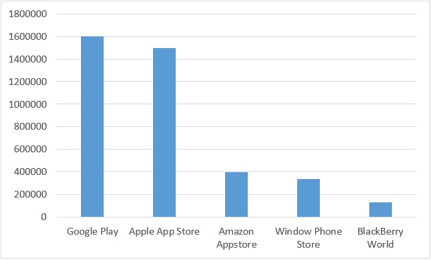 图表1:全球5大应用商店应用数量分布(来源:Statista,2015)
