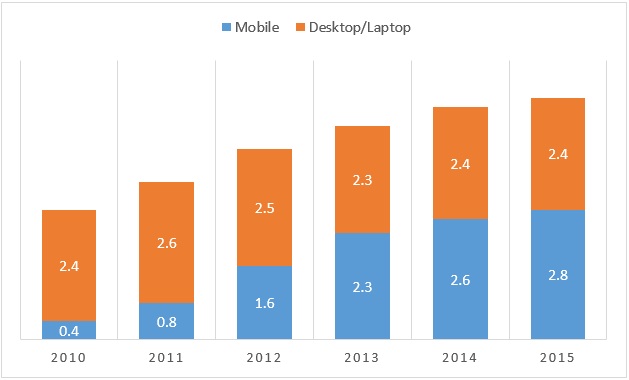 图表2:花费在移动设备和台式/笔记本电脑上的日均时间/小时(来源:eMarketer, 2015)