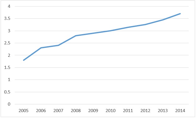 图表5:美国远程办公者数量(单位:百万,来源:Global Workplace Analytics,2015)