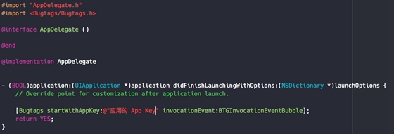 随后,用户即可在项目的 AppDelegate.m 中导入 Bugtags SDK 头文件,并在 application:didFinishLaunchingWithOptions: 方法中加入以下代码: