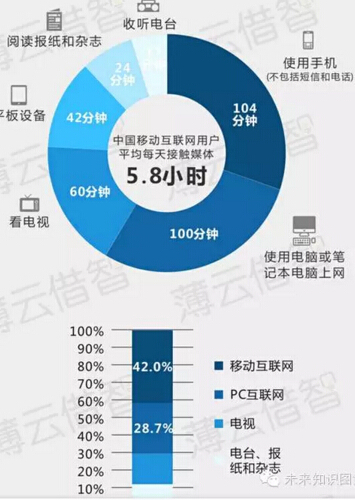 因为移动互联网的便捷易接入性、随时随地性、更多功能集成,以及更大普及人群,形成对人信息消费时间的更多占领。表现为用户使用智能手机的时间高速增长,而对电视,报纸等媒体的投入时间则不断下跌。
