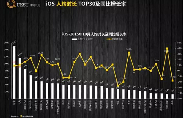 而在中国的移动应用中,占用户时间最长的是通信社交,以微信、QQ为代表。这是2015年10月Android和iOS用户使用总时长对比,腾讯携微信、QQ以绝对优势领先:
