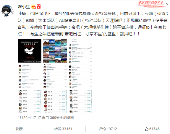 昨晚的“帝吧出征FB”,可以称得上是能载入史册的事件。自一段时间前的香港爱国人士陈净心和台湾爱国人士黄安接连举报支GD、TD艺人起,周子瑜,黄安,林更新,罗志祥,谢霆锋,何韵诗等人也都因两岸三地的关系看法在FaceBook上挑起了网民们的火花。而台湾大选民进党的蔡英文当选更是将事件推向了高潮,表情包什么的火了,黄子韬也火了。