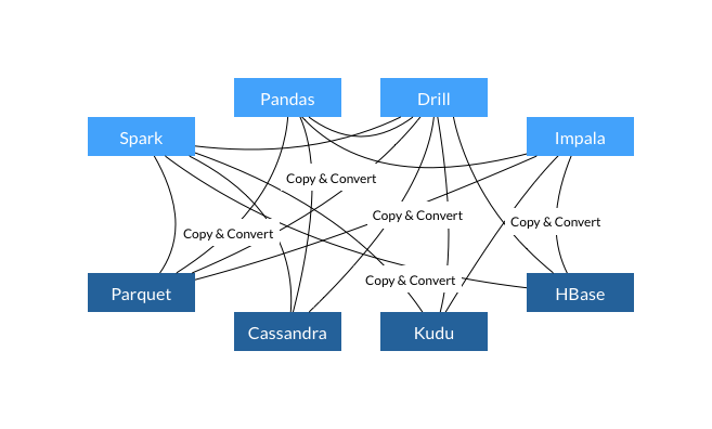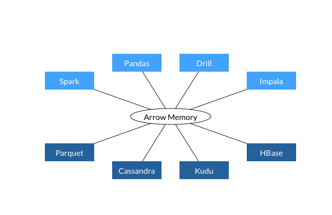 用户在应用大数据分析时除了将Hadoop等大数据平台作为一个经济的存储和批处理平台之外也很看重分析系统的扩展性和性能。过去几年开源社区已经发布了很多工具来完善大数据分析的生态系统,这些工具涵盖了数据分析的各个层面,比如列式存储格式(Parquet/ORC)、内存计算层(Drill、Spark、Impala和Storm)以及强大的API接口(Python和R语言)。Arrow则是最新加入的一员,它提供了一种跨平台跨应用的内存数据交换格式。