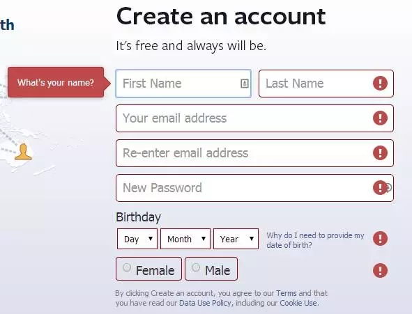 例如,某些色盲患者有可能根本无法注意到红色的报错信息。所以,大可以同时使用颜色和符号来吸引用户的注意。例如,Facebook表单字段的红色警示符号和说明文字。