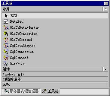 在工具箱中,您可以找到 Data(数据)选项卡,其中包括常见的数据对象,例如