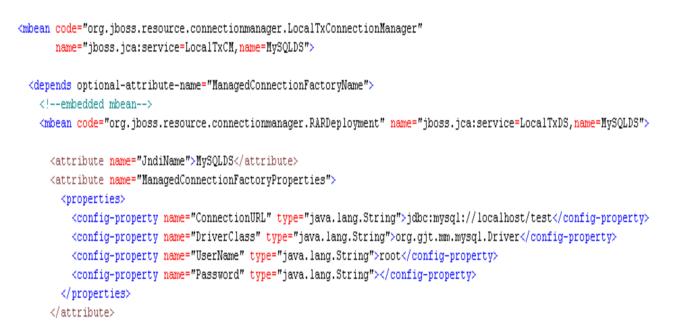 图一是配置好的mysql-service.xml文件的一段代码样本,通过属性设置可以定制数据源的名称和有关连接的其他属性。注意该文件中所有name属性必须保持一致。