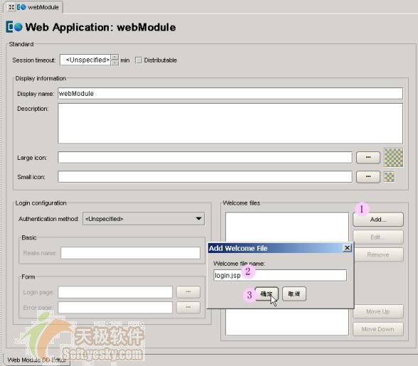点击Welcome files列表右边的Add…按钮,在弹出的对话框中录入login.jsp并按确定按钮,将login.jsp页面作为默认页面,这样web.xml部署描述文件中将新增以下粗体的部署信息: