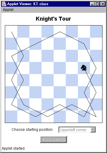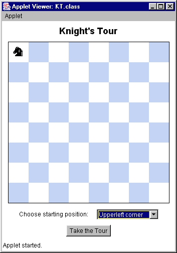 Tour)小程序, 用来演示一个限制版的骑士巡游问题。 骑士并不是从任何一个方格开始, 而是从角落上的四个方格之一开始。这个applet的界面如图1所示: