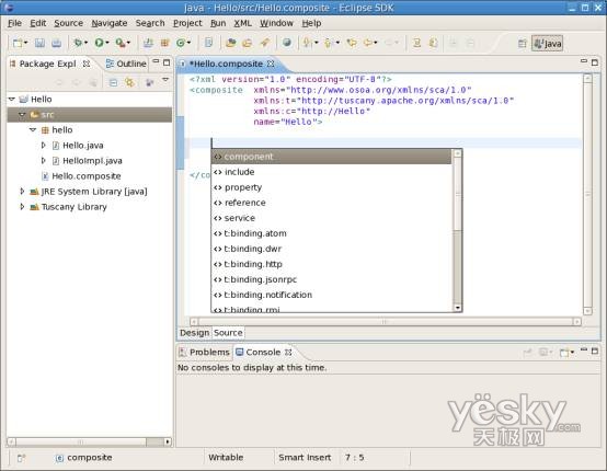 现在将HelloImpl类转化为一个SCA组件。我们需要创建一个SCA Composite文件来描述组件的服务和绑定配置。