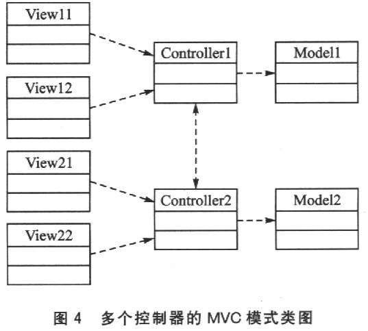 当应用程序界面很多时,可以改变这种情况使用多个控制器的MVC模式,如图4所示。