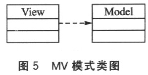 上面的两种程序设计模式已经很常见于PC上的应用软件设计,包括WEB应用或J2EE中的设计。但是通常来说,由于基于移动设备的J2ME应用软件复杂程度相对PC上的要低许多,有时候本来就只有几个类,如果完全照搬PC上的MVC模式,反而会使程序框架变得更加复杂。这时,可以采用以下的一种变形:MV模式(或称为MC-V或M-VC模式),如图5所示。