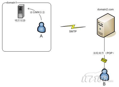 只要用户A发送的数据格式和前面domain1发送的相同,对于domain2来说,没什么区别。而且在这种方式下,如果邮件发送失败,比如收件人地址不存在,用户A会马上得到邮件发送失败信息。所以在实际的应用中,这种方式比较常见。但是这种方式需要知道对方的SMTP服务器的地址,在Windows下,可以在命令行执行nslookup,输入