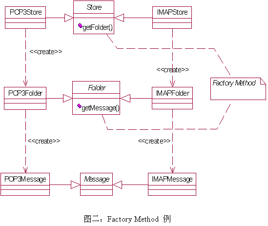 Method,有一个潜在的不利因素,那就是为了创建一个特殊的对象,必须有相应于Creator的一个子类。如上所述创建一个Pop3Folder对象必须要有一个Store的子类Pop3Store,