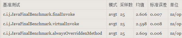 这些基准测试的源代码在GitHub上有。我没有把结果都放到起以免产生混淆。多态的基准测试是运行PolymorphicBenchmark的结果,而其它的是运行JavaFinalBenchmark的结果。
