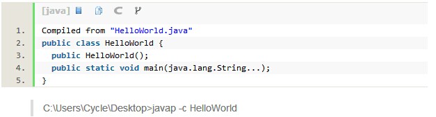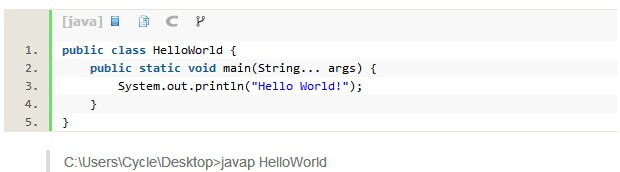 javap是一个Java类文件反汇编程序,可以查看Java编译器生成的字节码,是分析代码的一个好工具。让我们用javap来编译这段Hello World代码,再分解它。
