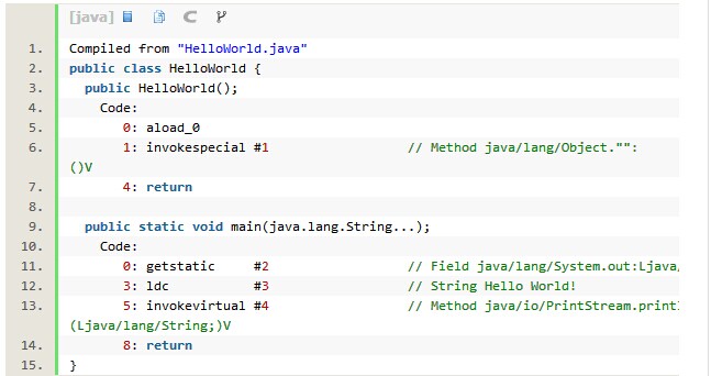 如果传递参数-c到javap里面,便会得到上面这个结果。这是一条非常好的信息,这样输出的指令可以帮助我们更好地了解JVM。