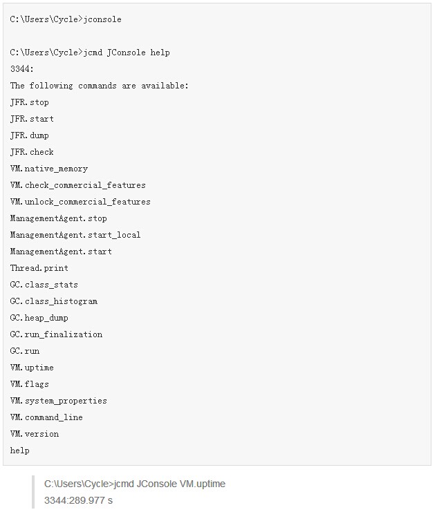 jcmd主要用来把诊断命令请求发送到Java JVM中,当JVM进程中没有jcmd参数列表时,jcmd就会立即运行。这相当于jps工具,我开始启动jconsole,并且把它作为参数传递到jcmd,得到如下结果,这个也可以通过进程id(pid)实现。