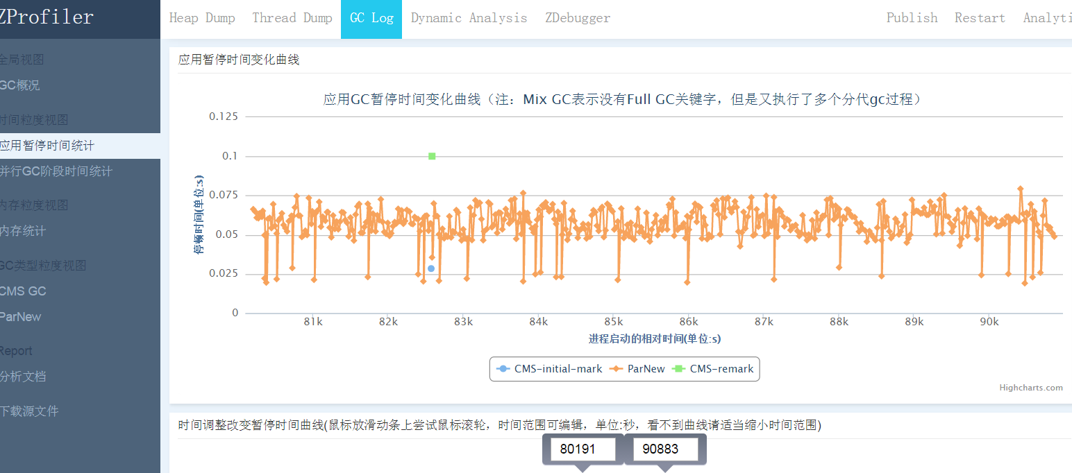 gclog分析是个苦差,因为gclog输出的信息非常多,但是很多时候我们需要关注的是长期的趋势和整体的统计信息,人工分析太耗时间。目前也有一些不错的gclog分析工具,比如GCViewer。ZProfiler除了做了和GCViewer类似的工作之外,前面谈到过,ZProfiler系统本身就是部署在金融云里的,这意味着用户可以非常方便地通过简单的WebUI操作把gclog直接复制到ZProfiler上来分析。另外,我们也正在开发一些更高级的一些功能,在gclog分析完成后,给用户一些直接的建议,比如是否GCPause的时间过长,设置的GC参数应该如何调整,GC花费的CPU时间是不是过长等。