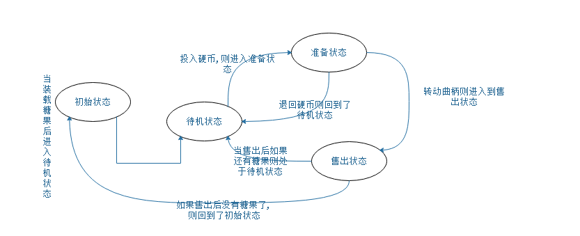 假设我们现在有一个糖果机项目,那么我们知道正常一般糖果机提供给用户的行为有这么几种:投入硬币、转动曲柄、退出硬币几种行为;那么糖果机呢一般有这几中状态,待机状态、持有硬币的准备状态、运行状态即正在售出状态和初始状态 这么几种正常状态。 我们发现处于不同状态的时候,持有的行为是不一样的,图如下: