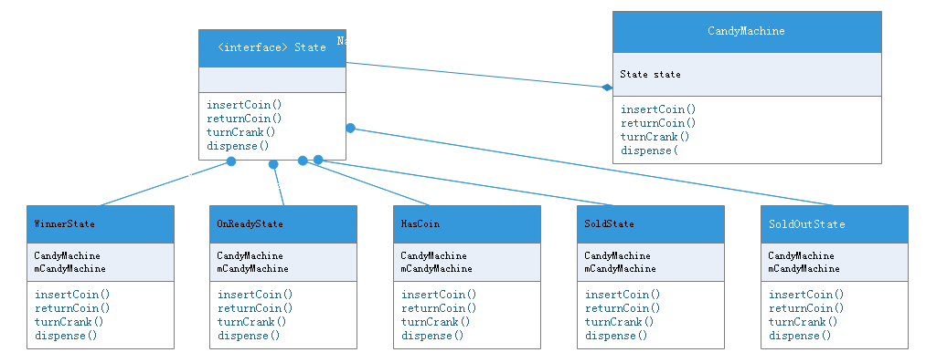 这个结构图告诉我们,提炼出状态接口出来,然后将各个状态抽出,并去实现接口,每个状态都持有投入硬币,退回硬币,转动曲柄、售出糖果这几种行为对应的方法做出相应;而糖果机持有所有的状态,并通过引用状态接口来操作各个状态;这种设计架构就是我们说的状态模式。