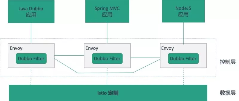上进行了一些扩展,实现了一个 Dubbo Filter,现在这部分代码已经被捐献到了 Envoy 的社区。数据层实现方式是对
