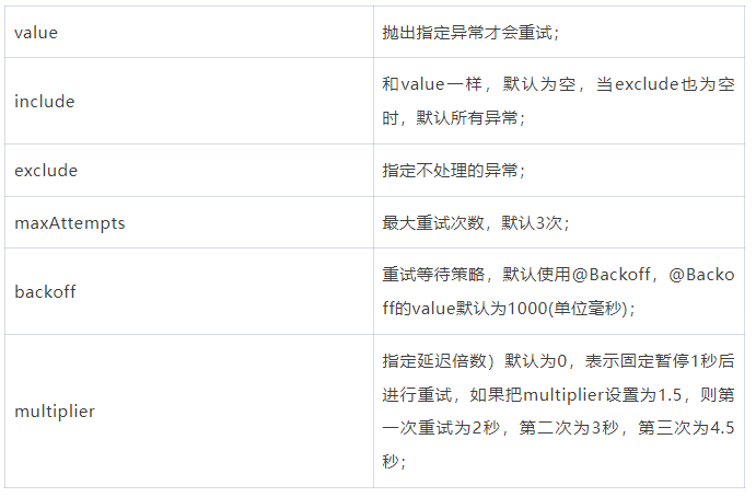 可以看到代码里面,实现方法上面加上了注解 @Retryable,@Retryable有以下参数可以配置: