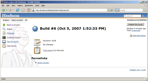 纠正错误并将修改签入 Subversion 之后,Hudson 最终会执行构建。在执行构建之后单击