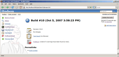 在图 12 中,Hudson 的 Build History 框显示一个尚未完成的构建。当这个构建完成之后(应该会顺利地完成),可以单击这个构建的日期来查看详细信息,见图