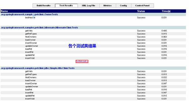 该tag页显示了自动化测试结果,该结果按照测试类分类,在每个测试类下显示了每一个方法的测试结果以及用时。每一个测试类中都有控制台输出日志,点击进入”system.out”