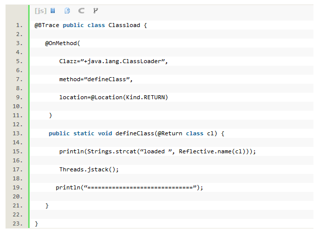 上述代码对全部ClassLoaders及其子类进行跟踪,当defineClass返回时,该脚本会列出载入的类并启动JStack。但是我们不建议在实际环境中长期使用BTrace。因为Java代理会造成一定的资源开销,同时需要编写不同的脚本来进行追踪。不过在想避免重启JVM的情况下在运行时环境修改跟踪脚本,BTrace是个不错的选择。