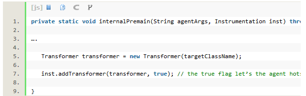在不改动服务器代码的前提下进行调试,JVM代理是最佳选择。类似于BTrace,我们可以尝试编写自定义Java代理。这种代理可以进入对象结构体然后在对象实例化的时候进行堆追踪。然后我们可以对结果进行分析并掌握具体的载入过程。这是BTrace所不具备的,因为BTrace有限制和只能进行读操作。请看下面的示例代码: