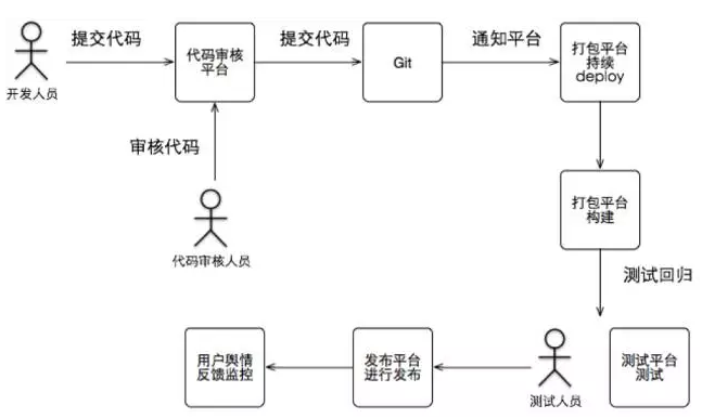 另外这个阶段建立起了代码审核、打包平台、发布平台、测试平台、舆情监控平台等,自动化了很多事情,在一定程度上提升了工作效率,大致使用流程如下: