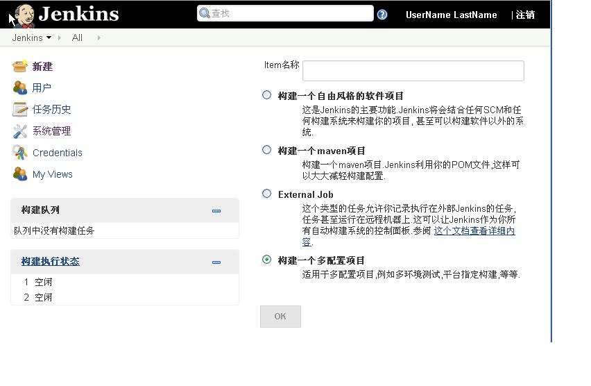 点击“新建”,新建一个任务。我要通过shell进行编译、构建,所以新建任务时选择的类型是“构建一个多配置项目”,如下图所示。