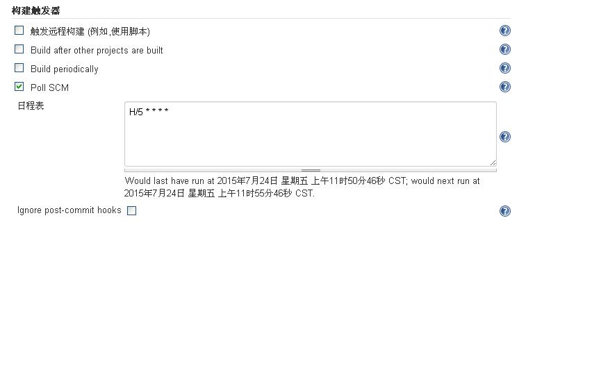 也就是什么时候开始自动构建。这里可以有不同方案,大家一看就知道是什么意思。我这里选择Poll SCM,该方案能定时检代码版本库是否有新的提交,如果有则自动构建。我设置的日程表是“H/5 * * * *”,即5分钟自动检查一次代码版本库是否有新的提交。