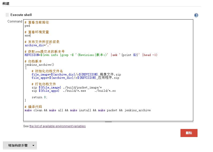 构建方式有很多种,我这里选择shell,因为我要用makefile来编译源码。需要提醒的是这里的SHELL是由Jenkins启动的,Jenkins设置了很多自己的环境变量,可以通过env打印出来研究下,里面很多信息是可以使用的。