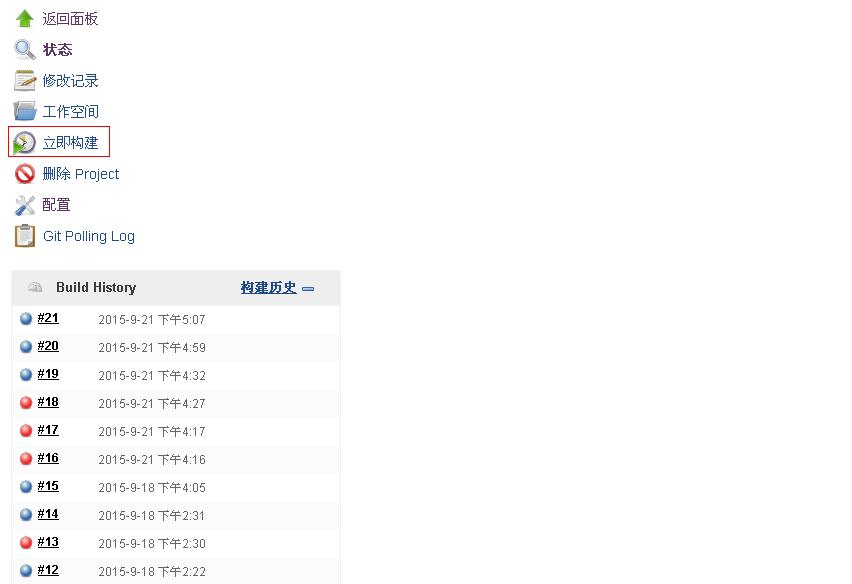 从下图的构建历史可以看出,蓝色表明构建成功,红色表明构建失败。在测试的过程中,代码版本库都没有新的提价,如何触发构建?可以通过“立即构建”来触发。