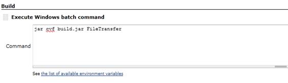 中 Java 代码编译并生成 Jar 文件。也可以根据项目的实际编写自己的 shell 脚本配置在这里。 图 13. 配置 Execute Windows batch command