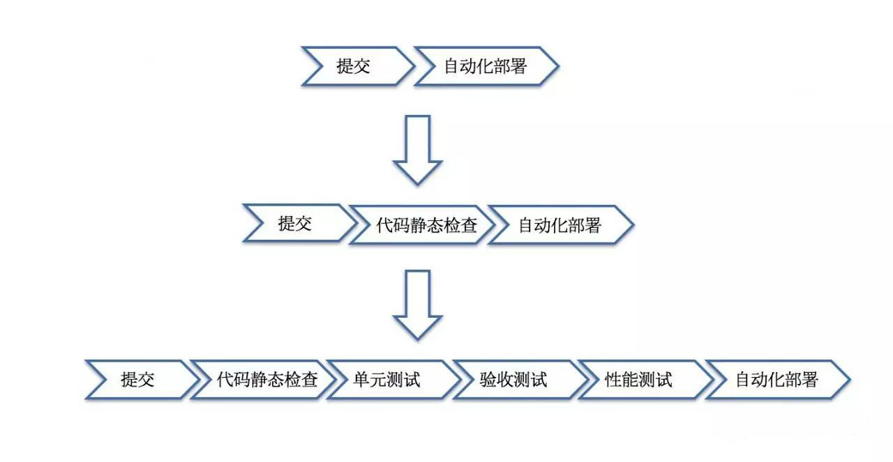 罗马不是一天建成的,持续集成不是一开始就是完美的,每个开发者心中都有一个比较理想的自动化工作流——持续部署,大概会经历这几个演变阶段:
