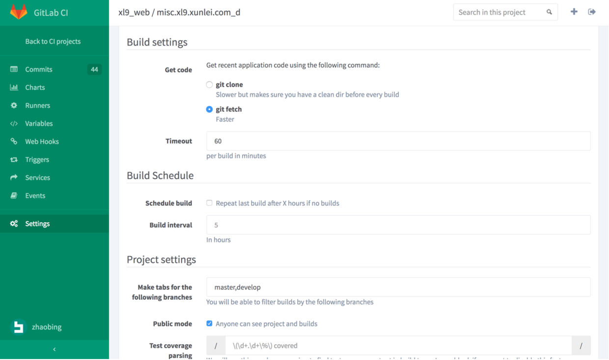 在自己的Gitlab中打开CI界面,比如迅雷的Gitlab,地址是 https://gitlab.xunlei.cn/ci/projects,找到自己项目后选择