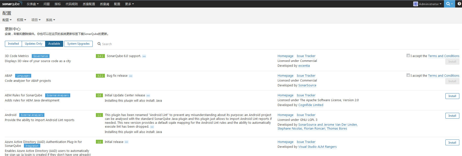 sonar安装插件有2种方式:第一种将插件下载完存放在sonar的插件目录,第二种使用web界面来使用安装