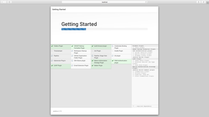 打开Jenkins官网下载最新的pkg安装包。安装完成之后,Safari可能会自动打开,如果没有自动打开,打开浏览器,输入http://localhost:8080。