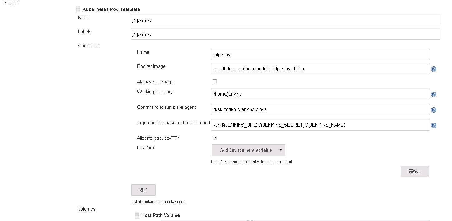 这里需要名却的是第一处的Name 就是子啊项目配置时的slave节点,label 是kubernetes进行管理用的。其余的配置项为slave容器需要的配置。