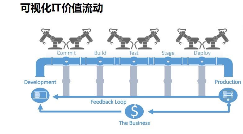 这个图我个人非常喜欢,我们原本单个存在的研发人员,通过流水线可以把他们连通起来。通过自动化赋有原有的人员更高的效率和能力。它不仅提供单点的效率,更重要的是提升整体的效率。